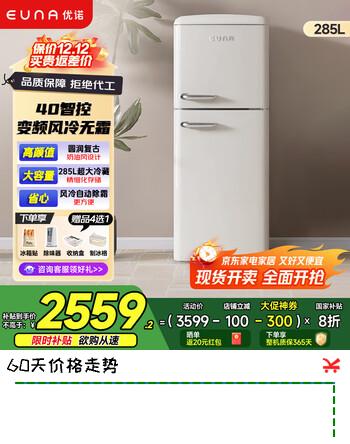 【8折】优诺(EUNA)285L大容量复古冰箱双门冷冻冷藏风冷无霜一级能效低噪家用客厅租房电冰箱BCD-285WRFC 【4D循环风冷】285WRFC诧寂中古风
