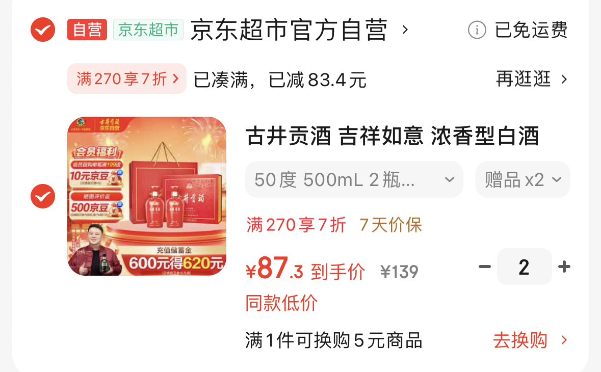 【自营】古井贡酒 吉祥如意浓香型500ml*2瓶礼盒