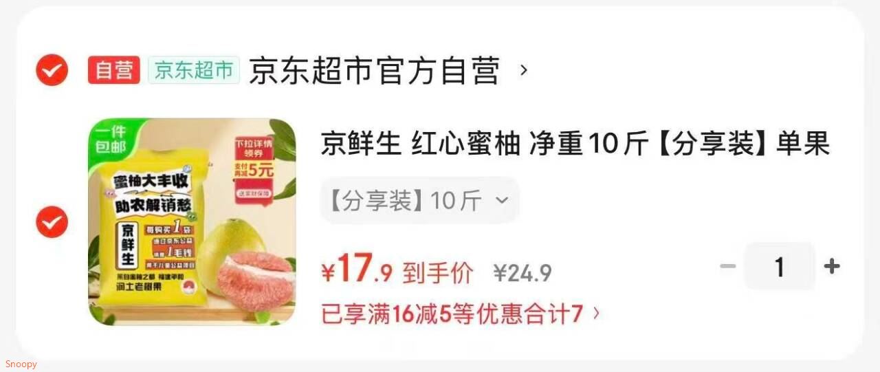 京鲜生 红心蜜柚 净重10斤 单果1.7斤起【17.9】