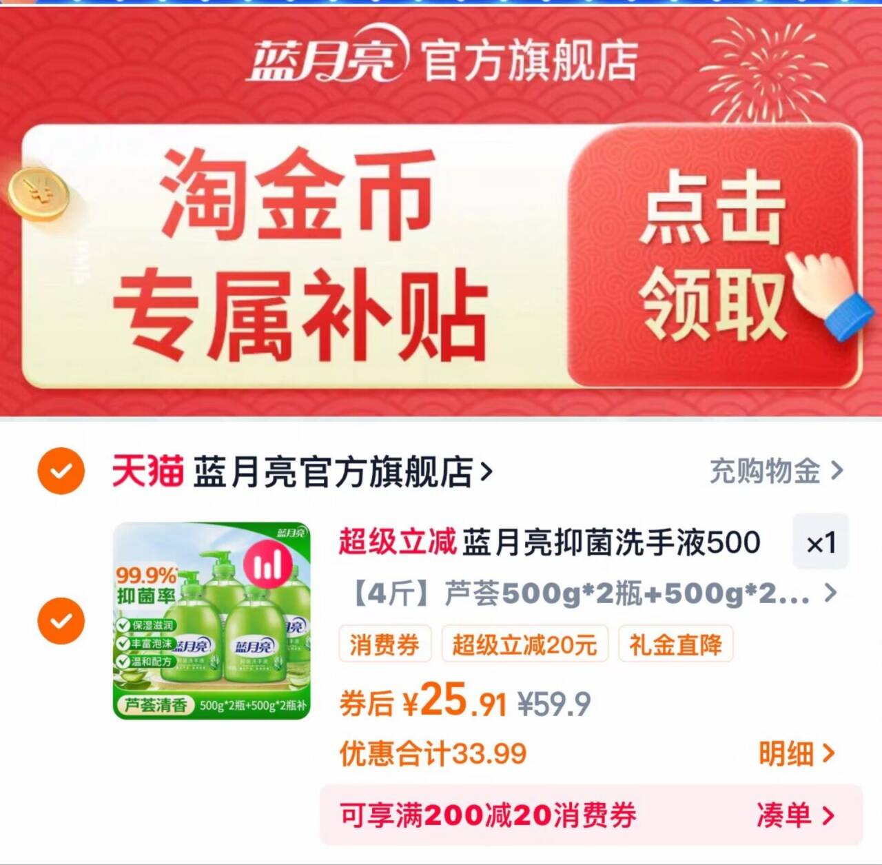 下滑详情淘金币 到手25.91亓元 蓝月亮抑菌洗手液4斤套补 洗手液活动少,还是蓝月亮