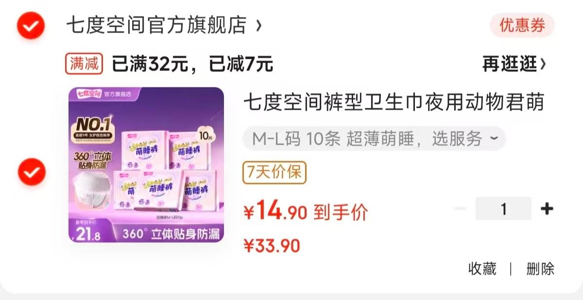 七度空间 裤型卫生巾 安心裤 10条【14.9】