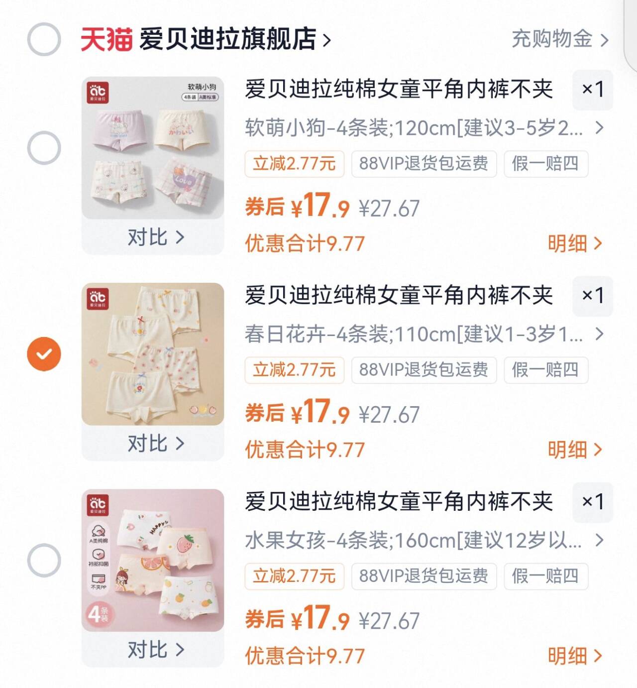 爱贝迪拉女童纯棉内裤 多歀任选,条17元.9