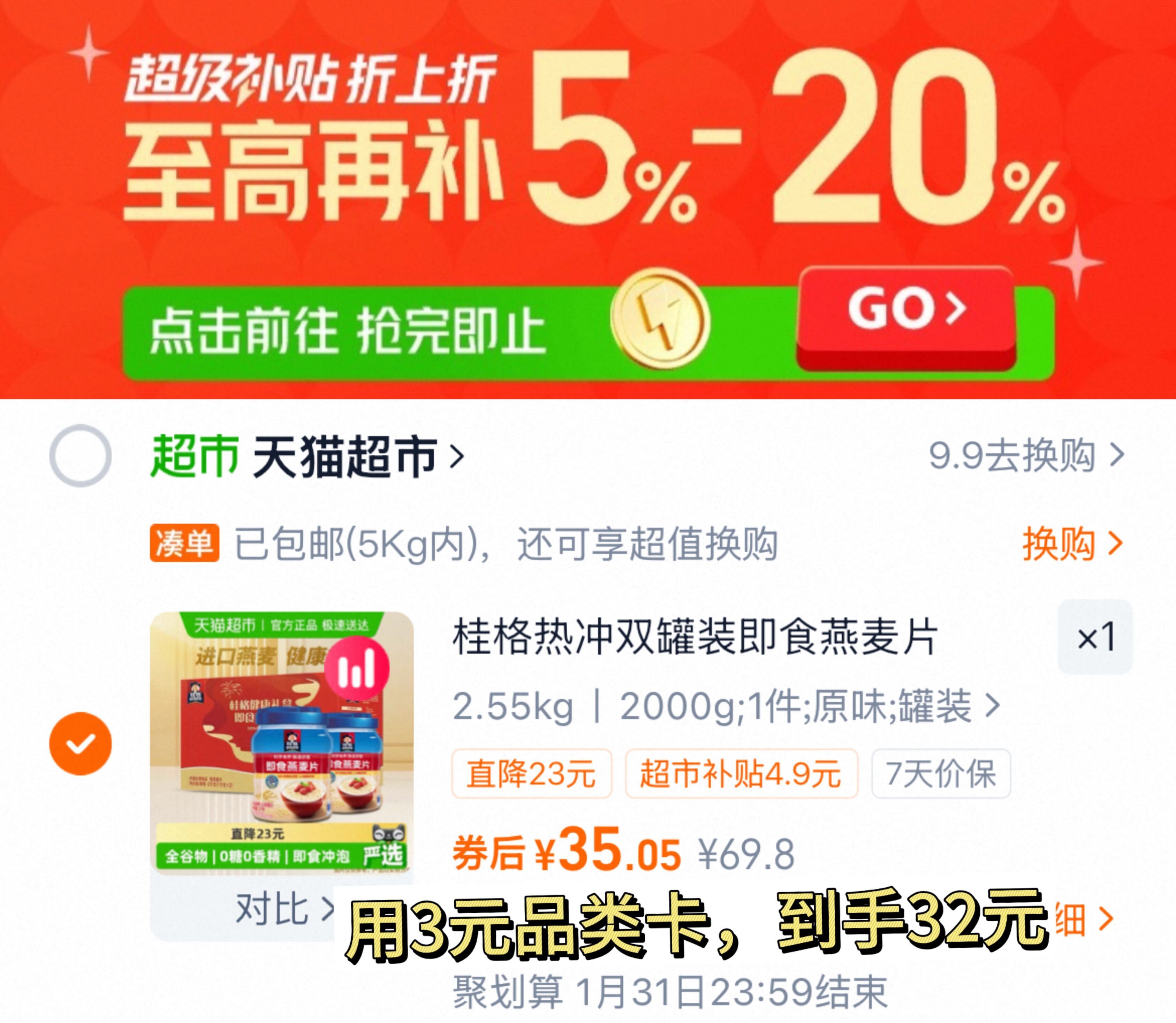 下拉详情拍 用3卡,vip35 17.5/罐 桂格即食燕麦片礼盒装1000g*2罐好单发报员2025年12月03日 13:260举报 下拉详情拍用3卡,vip35(17.5/罐)桂格即食燕麦片礼盒装1000g*2罐https://m.tb.cn/h.7aqKJ6N复制文案