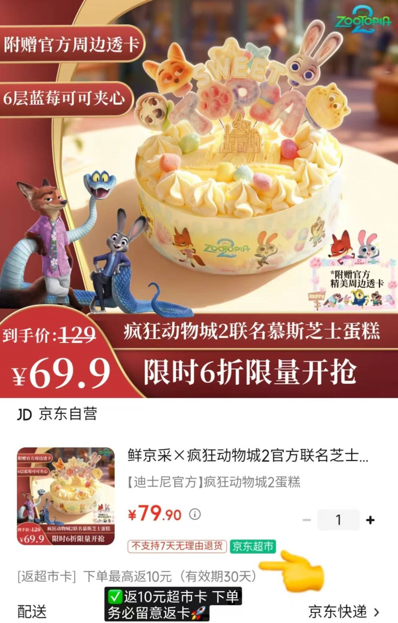 疯狂动物城联名蛋糕 自营 鲜京采×疯狂动物城 联名芝士慕斯蛋糕550g/6寸好单发报员2025年12月10日 07:070举报 ——疯狂动物城联名蛋糕——【自营】鲜京采×疯狂动物城联名芝士慕斯蛋糕550g/6寸https://u.jd.com/ZOrR3T169.9亓包邮,反10亓超.市卡*附赠官方周边透卡 都来冲啊复制文案
