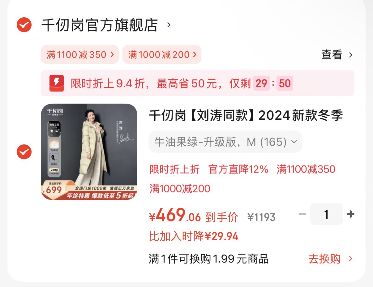 领1000-200券 千仞岗刘涛同款长款羽绒服 弹9.4折立减,拍下469亓 好单发报员 2025年12月13日 11:43 0 举报 领1000-200券https://u.jd.com/Z6WC5yn千仞岗刘涛同款长款羽绒服 弹9.4折立减,拍下469亓https://u.jd.com/Z6Wi9Ow 复制文案