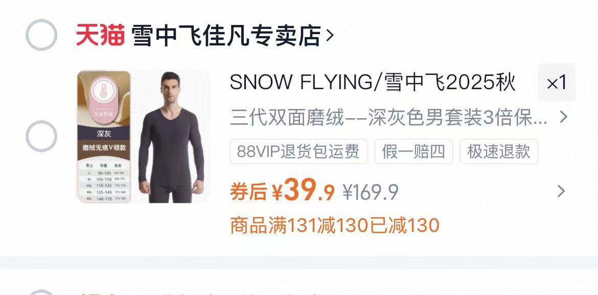 雪中飞双面磨毛保暖套装 拍1套39.9元