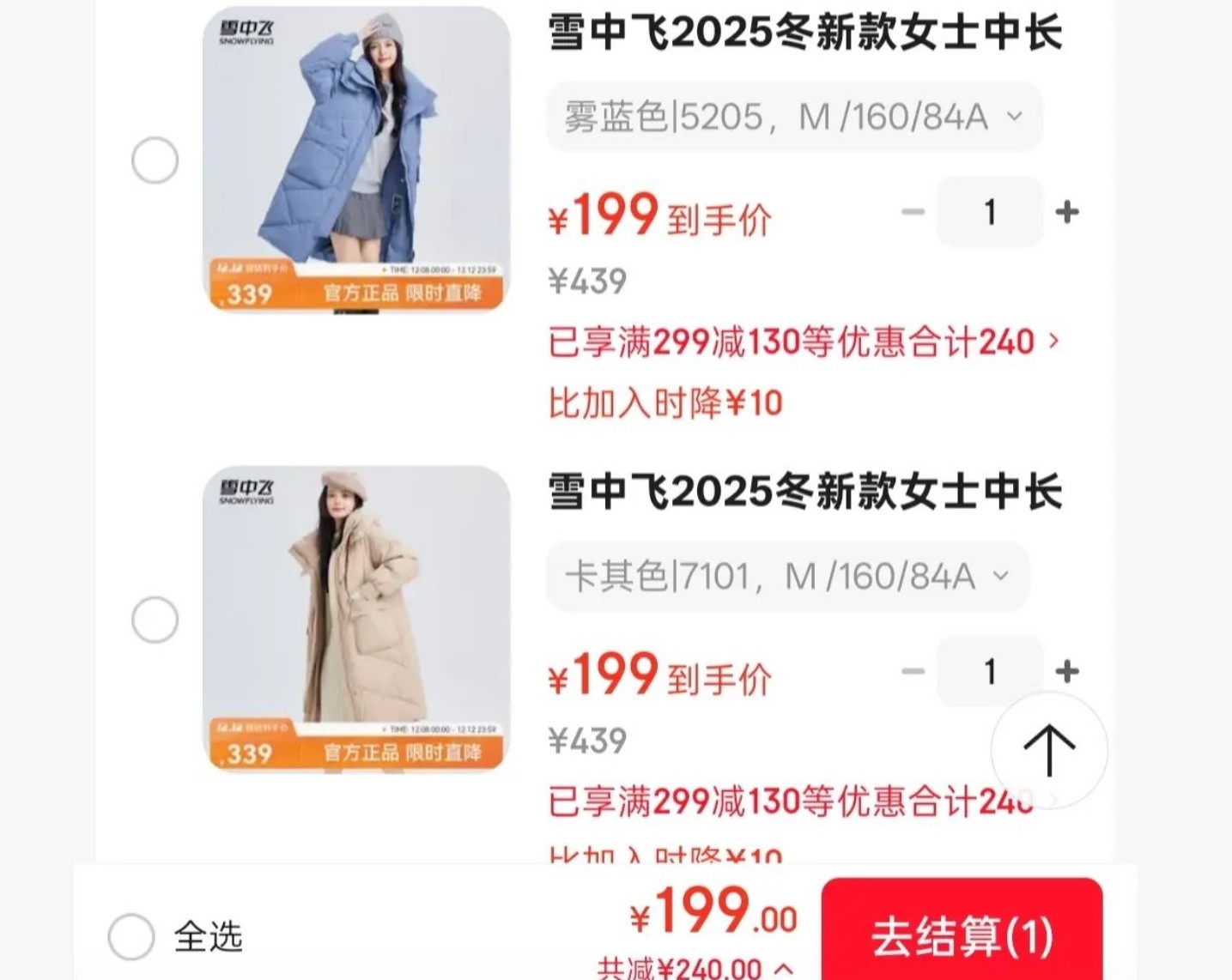 雪中飞 女士中长款羽绒服 90%含绒量【199】