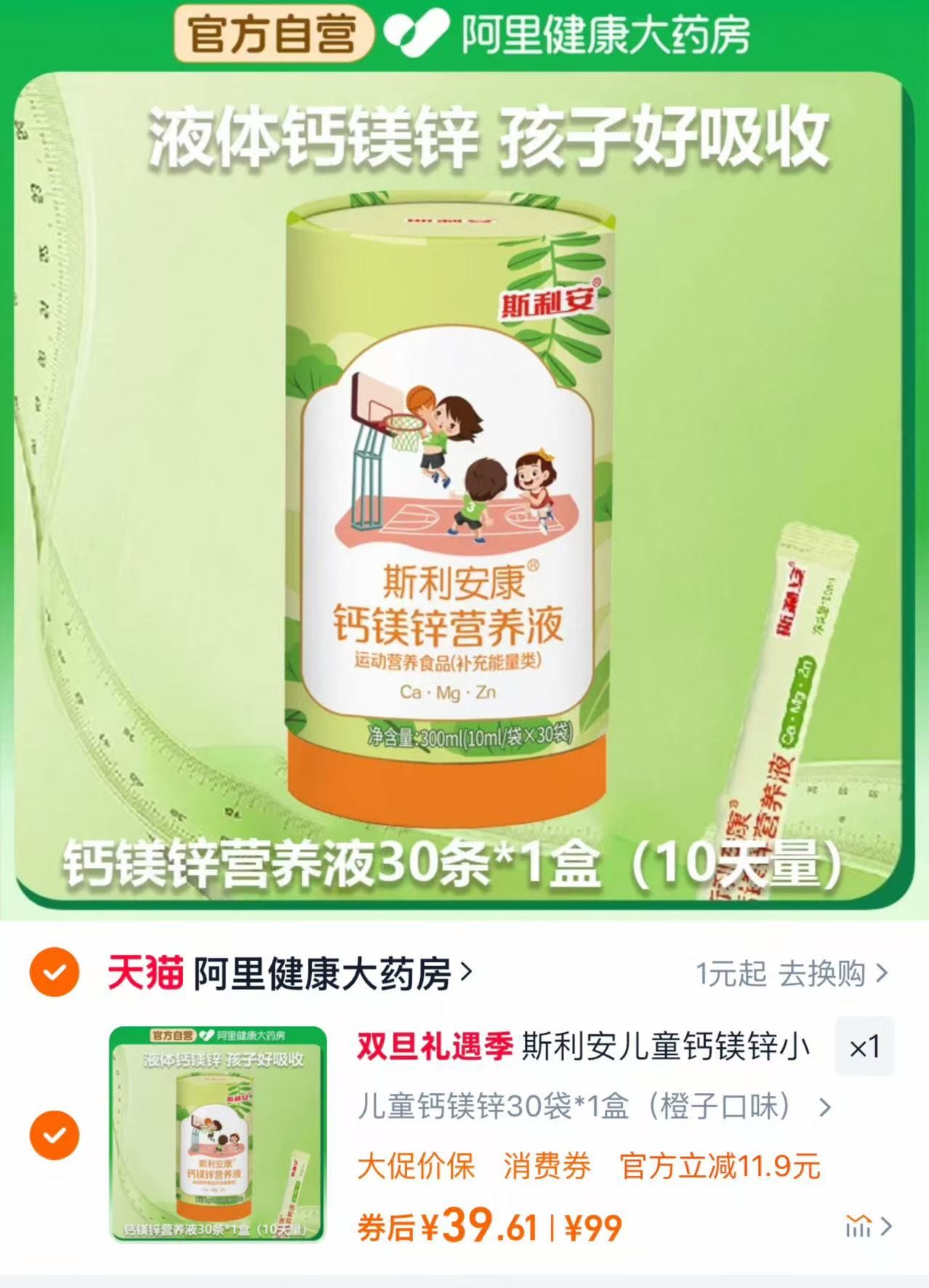 斯利安钙镁锌小金条30条,淘金币频道加购,凑单200-25消费券,88vip付【39.6】