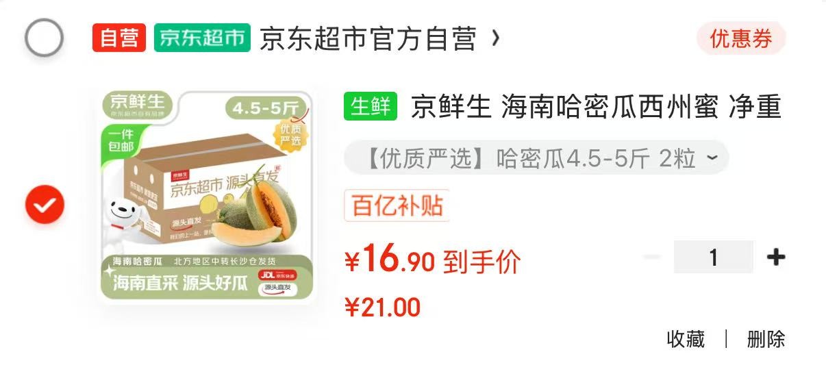 京鲜生 海南哈密瓜西州蜜 净重4.5-5斤 2粒装 单果2.3斤起【16.9】