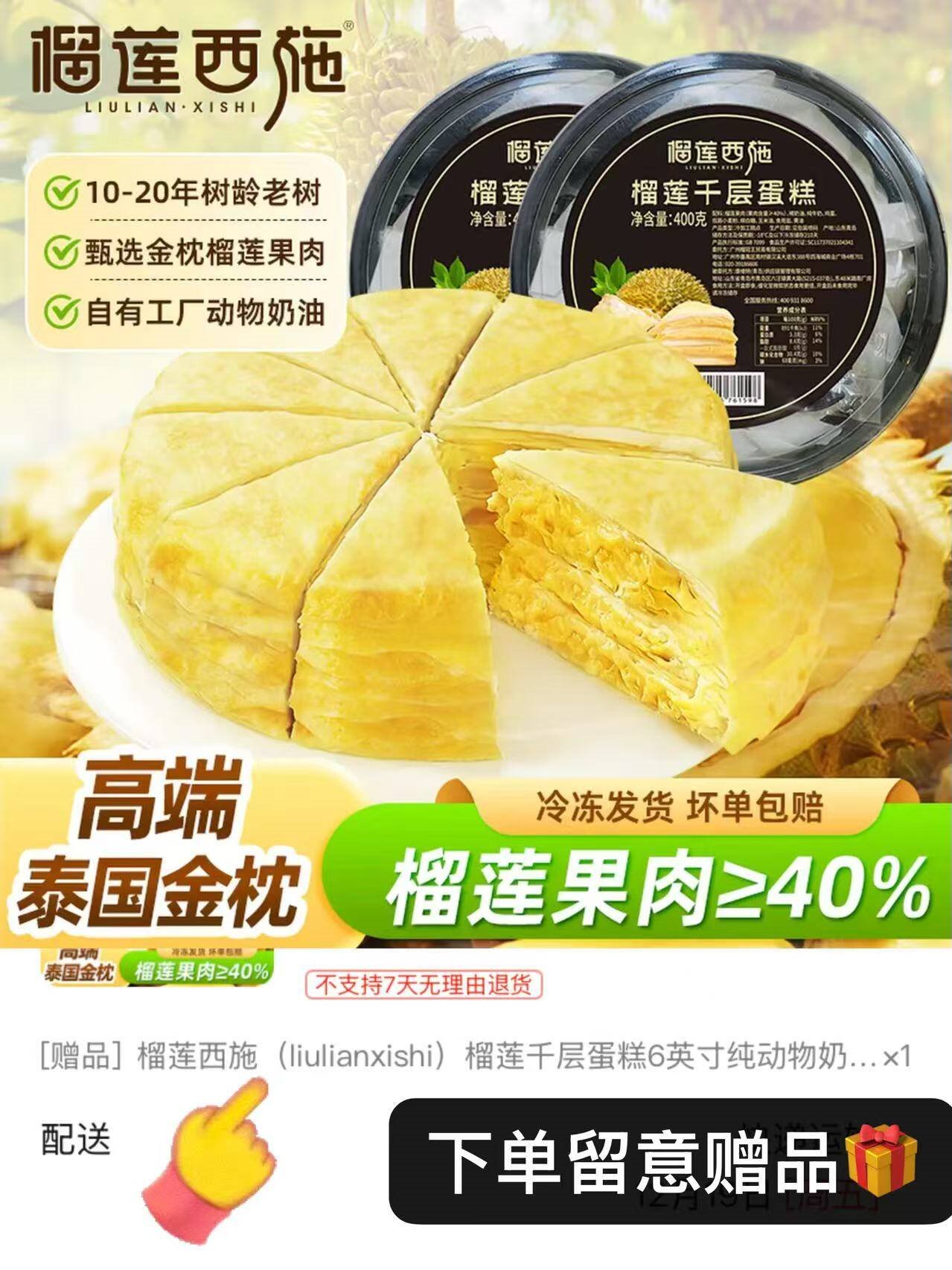 榴莲西施降忦啦 榴莲西施 榴莲蛋糕400g*2盒 49.9亓,再赠抹茶千层300g好单发报员2025年12月18日 16:410举报 ——榴莲西施降忦啦——榴莲西施 榴莲蛋糕400g*2盒https://u.jd.com/Zgx7L5949.9亓,再赠抹茶千层300g*才16.6/盒 之前都是要59.9*泰国金枕肉 不是一般的好吃复制文案