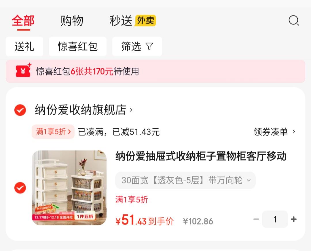 纳份爱 收纳柜家用免安装加厚零食柜 50CM面宽 透茶 五层【59】晒图返3元