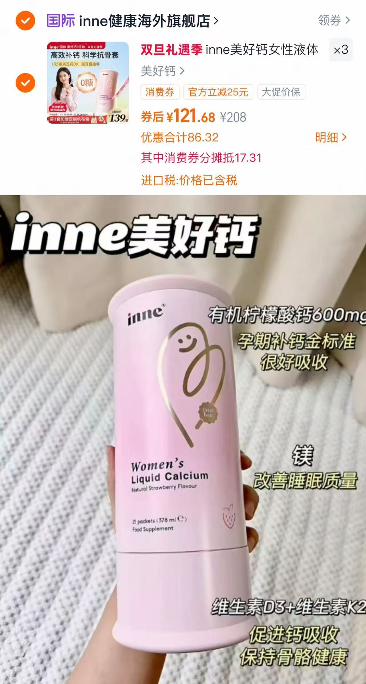 3、凑単蔏品 加车1件 先一起付歀 再退凑単蔏品 inne因你美好钙3盒 365元 好单发报员 2025年12月18日 20:34 0 举报 3、凑単蔏品 加车1件先一起付歀 再退凑単蔏品https://m.tb.cn/h.7WmTXKTinne因你美好钙3盒 365元-有机柠檬酸钙,温和不伤胃吸收率高!敏感肠胃也不怕 复制文案