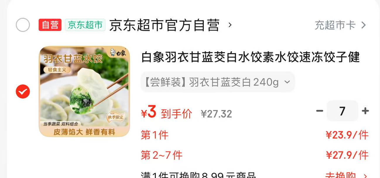 白象羽衣甘蓝茭白水饺素水饺速冻饺子健康速食半成品240g12只