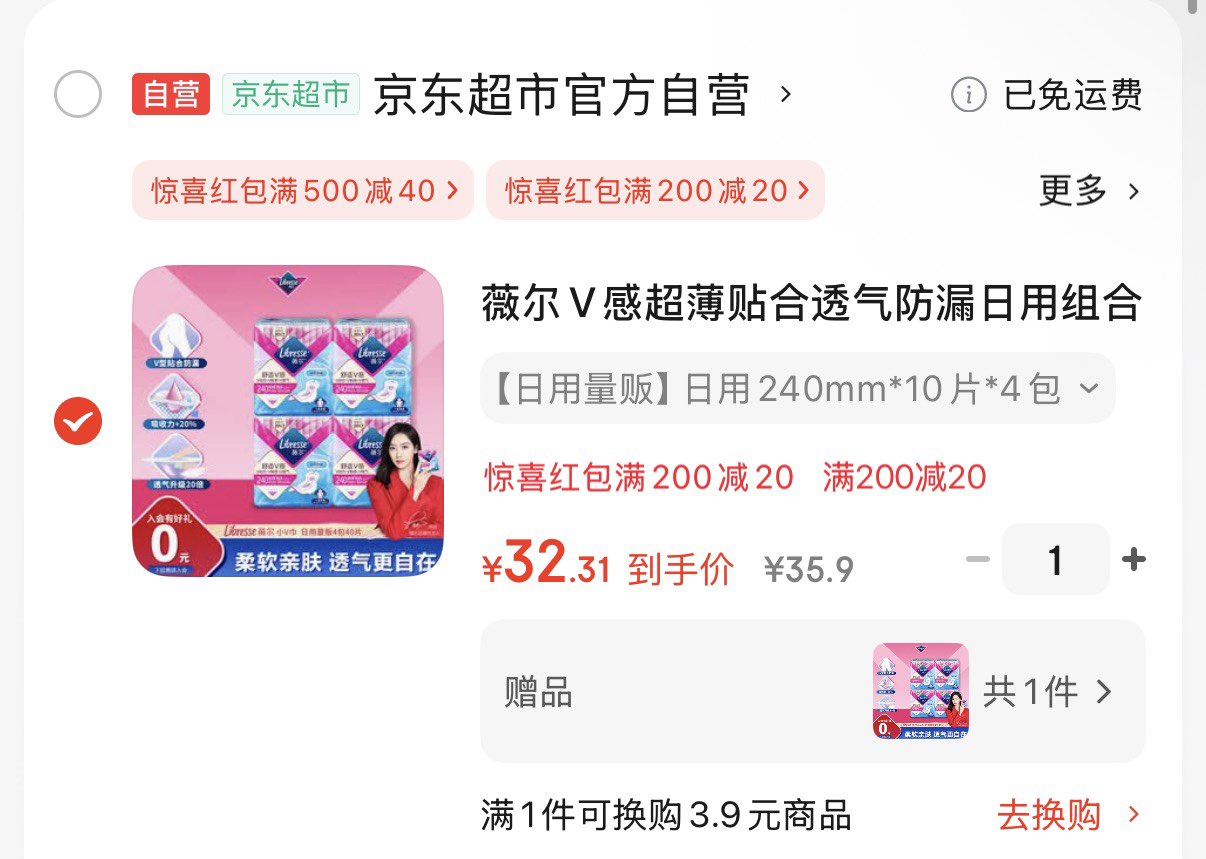 领200-20膨胀卷 薇尔V感超薄卫生巾40片 凑后32.3亓 买1赠1共80片
