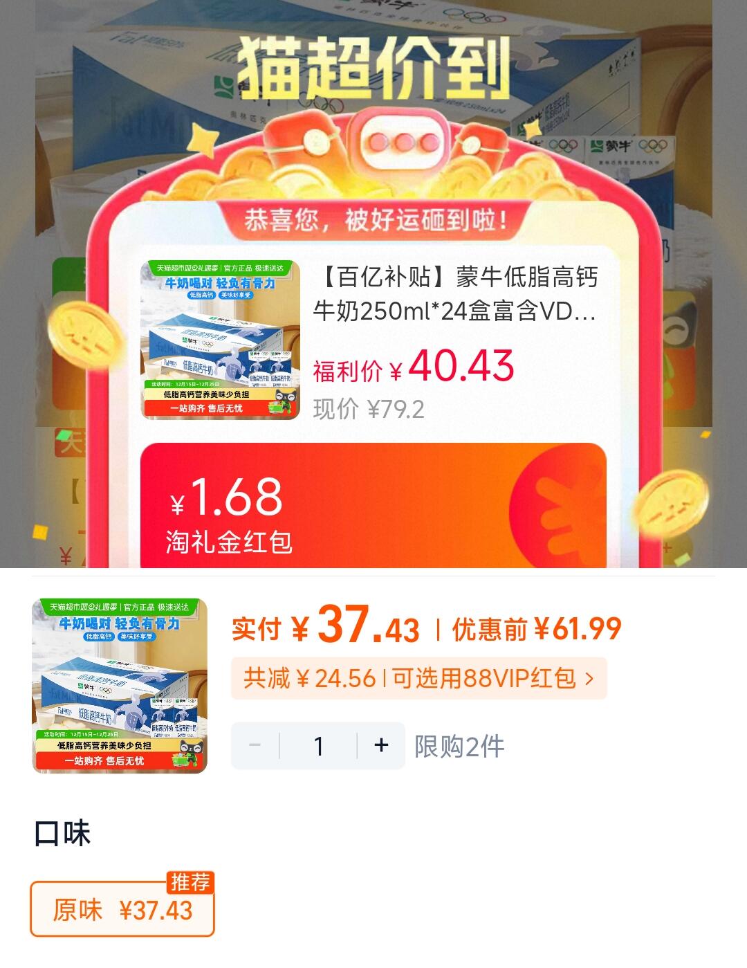 37.4亓 1.5/盒 蒙牛低脂高钙牛奶250ml*24盒好单发报员2025年12月19日 11:190举报 37.4亓(1.5/盒)蒙牛低脂高钙牛奶250ml*24盒https://m.tb.cn/h.7WA8Yis复制文案