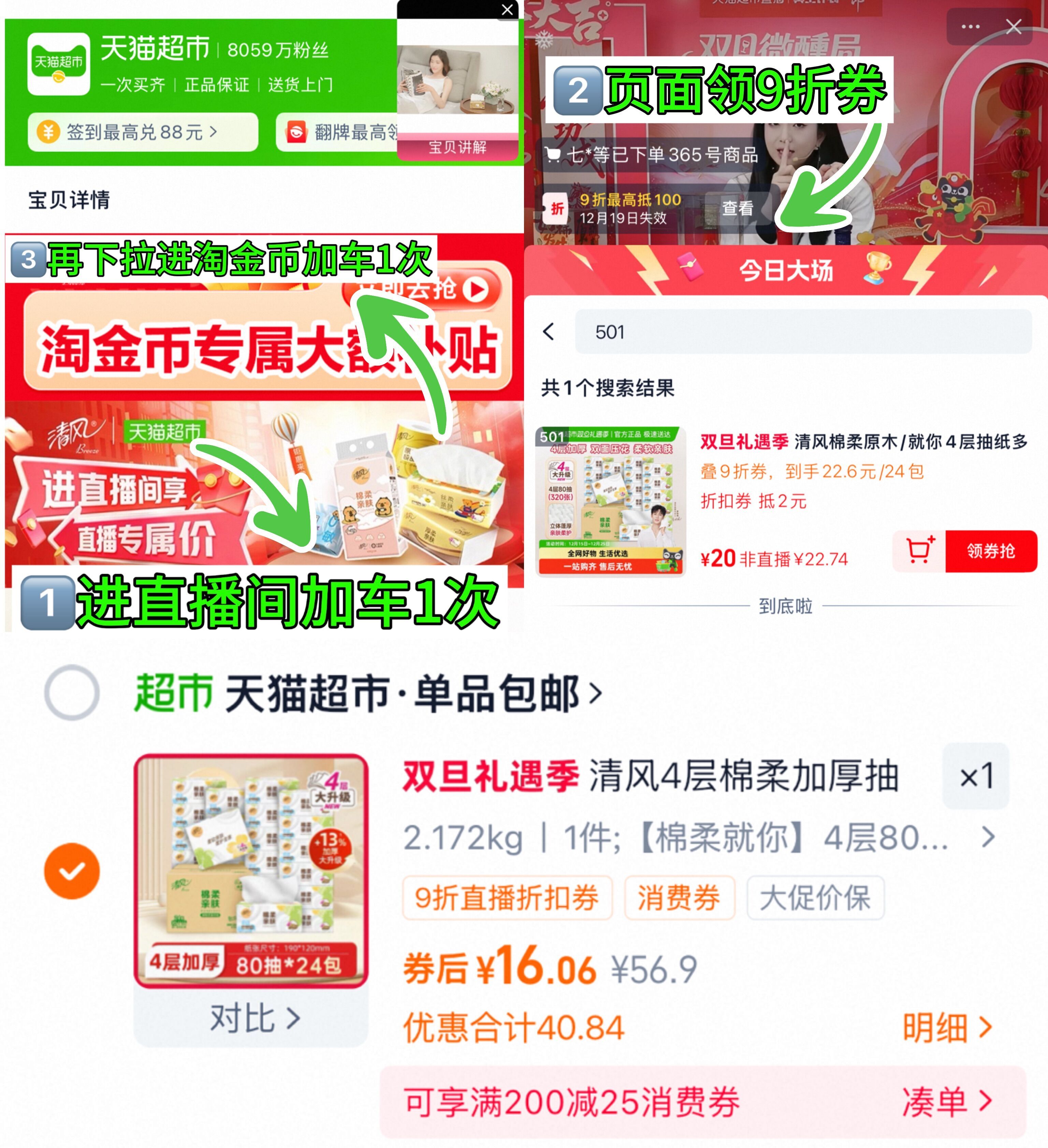 16.6亓 0.6/包 清风棉柔抽纸加厚4层24包 ①先下拉进直博间