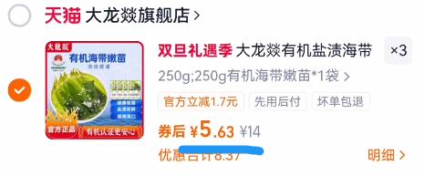 小神圿折合5.6亓/件 直接拍3件16.8亓, 大龙燚 海带苗250g*3袋好单发报员2025年12月19日 18:070举报 小神圿折合5.6亓/件直接拍3件16.8亓,【大龙燚】海带苗250g*3袋https://m.tb.cn/h.7342WB5复制文案