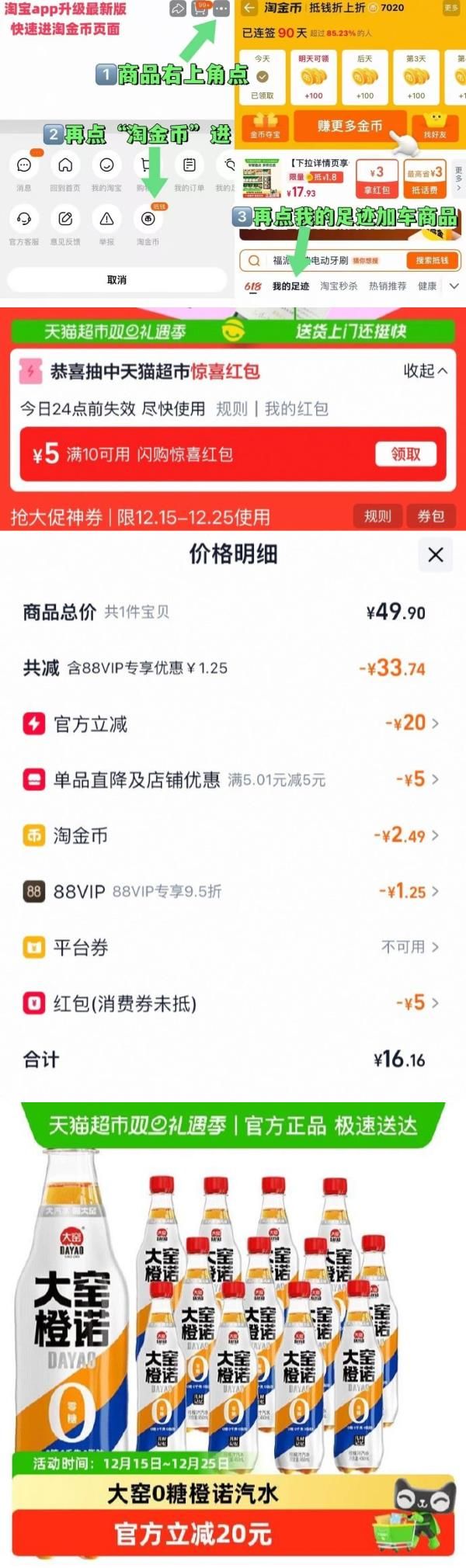 淘金币页面我的足迹加购,拍1件vip【16.16】