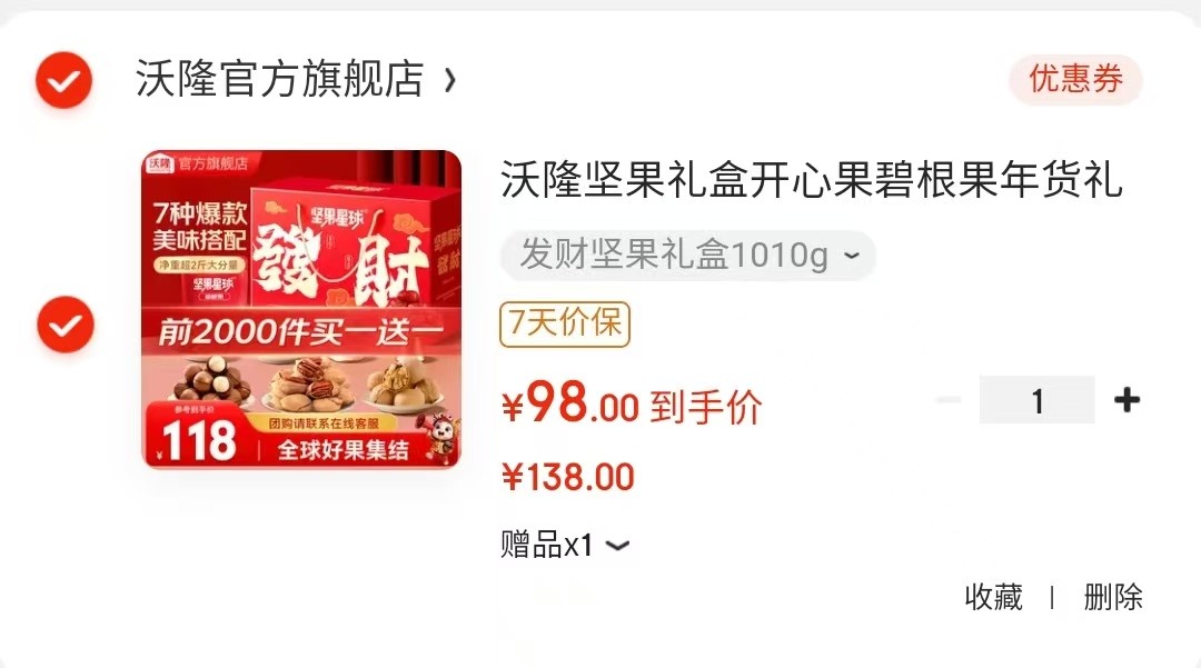 沃隆 坚果礼盒开心果碧根果年货礼盒 1010g【98】买一送一
