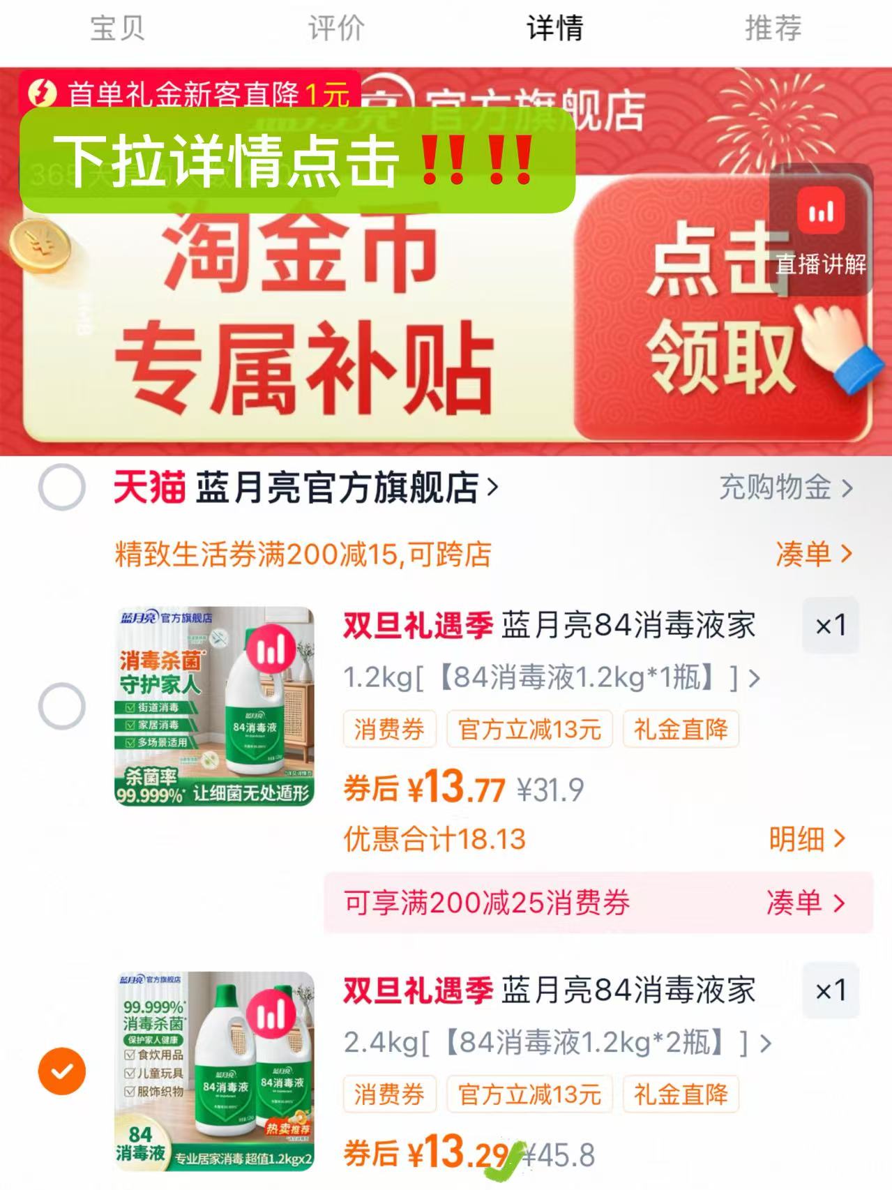 ②下拉详情13元.3 蓝月亮84刹菌消毒液1.2kg*2瓶好单发报员2025年12月20日 18:080举报 ②下拉详情13元.3蓝月亮84刹菌消毒液1.2kg*2瓶https://m.tb.cn/h.7VN6f22复制文案