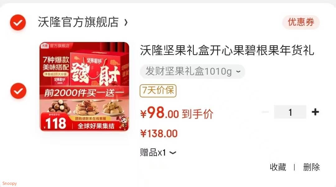 领99-40 沃隆 坚果礼盒开心果碧根果年货礼盒 1010g 98 买一送一好单发报员2025年12月21日 17:000举报 领99-40 https://coupon.m.jd.com/coupons/show.action?key=c0m1c3s8o8aa487fa5bb5e0b580c44ee&roleId=1855631003沃隆 坚果礼盒开心果碧根果年货礼盒 1010g【98】买一送一 https://u.jd.com/A1CTXtM 复制文案