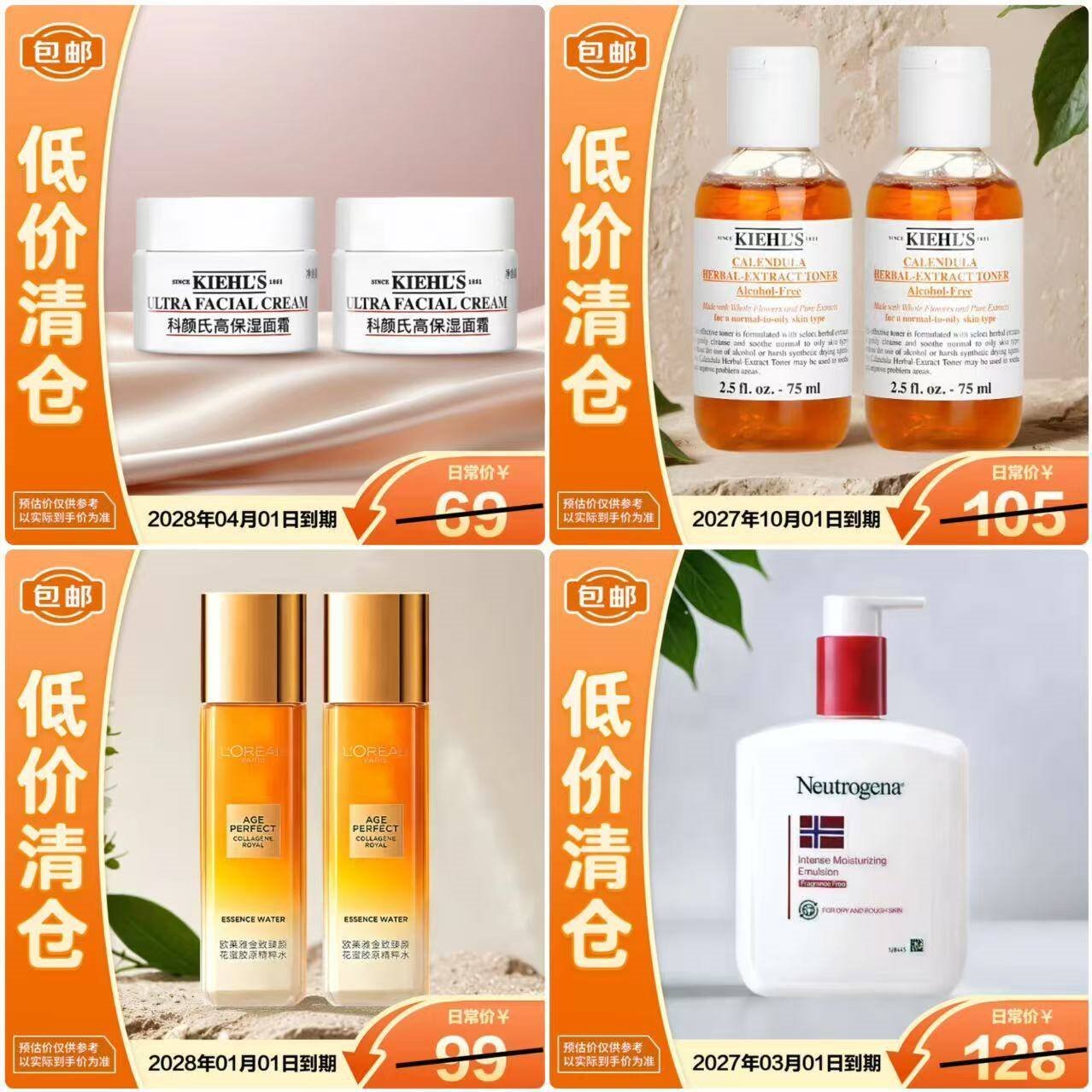 自营美妆合集車 47.9 科颜氏高保湿面霜14ml*2 49.9 欧莱雅花蜜精粹水65ml*2