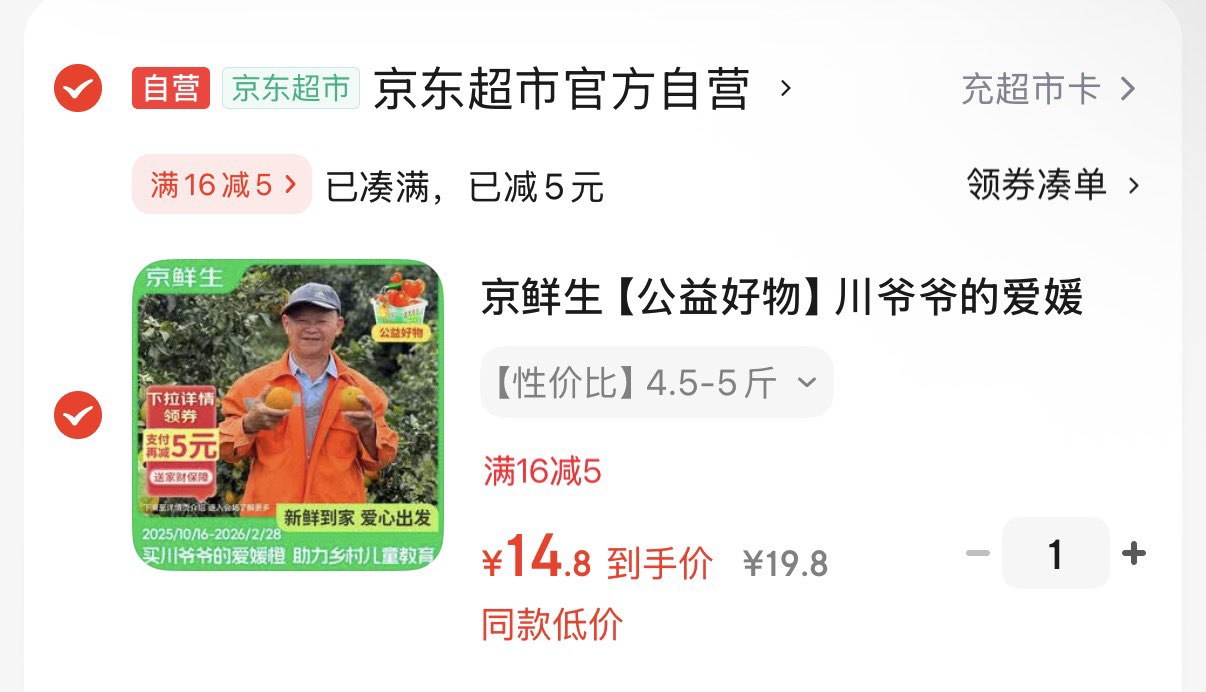 京鲜生爱媛38号果冻橙 拍下14.8亓 净重4.5-5斤 好单发报员 2025年12月22日 10:18 0 举报 京鲜生爱媛38号果冻橙 拍下14.8亓 净重4.5-5斤https://u.jd.com/AOKvOV9 复制文案
