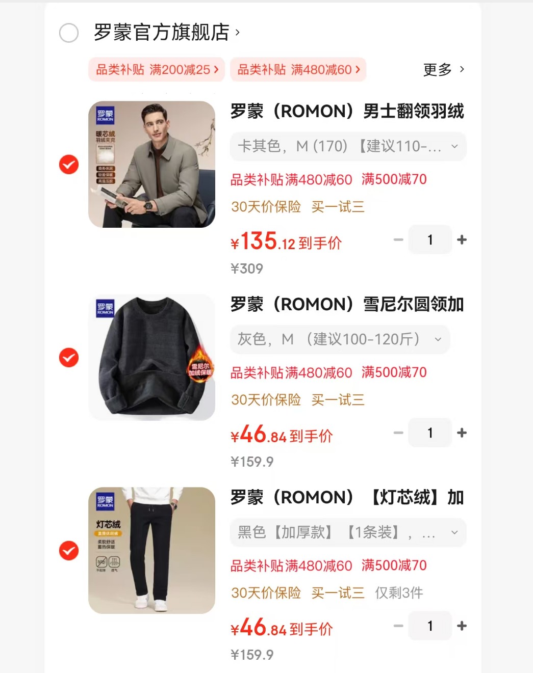 罗蒙 (ROMON)男士翻领羽绒服 雪尼尔圆领加绒针织衫 灯芯绒加厚休闲裤,各拍1件【229】