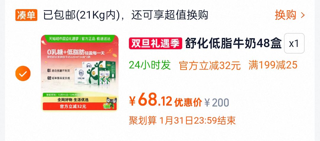 伊利舒化无如糖低脂牛奶220ml*24盒*2箱