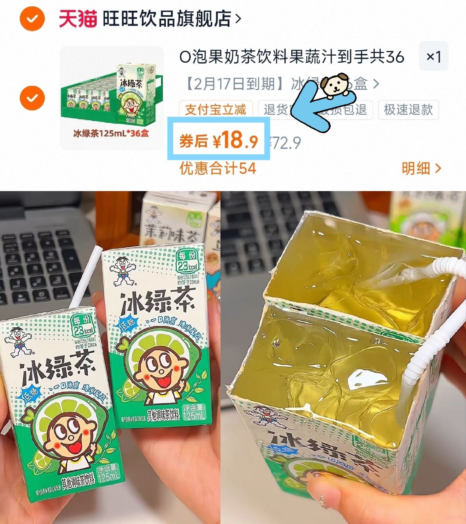 旺旺低糖冰绿茶125ml*36盒