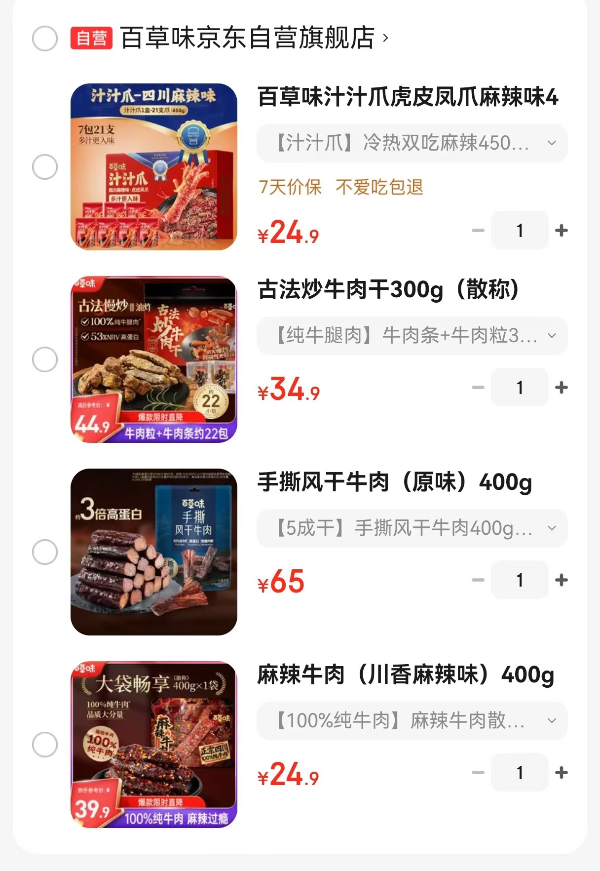 百草味 刚需类 虎皮凤爪麻辣味21只 24.9 古法炒牛肉干300g 34.9
