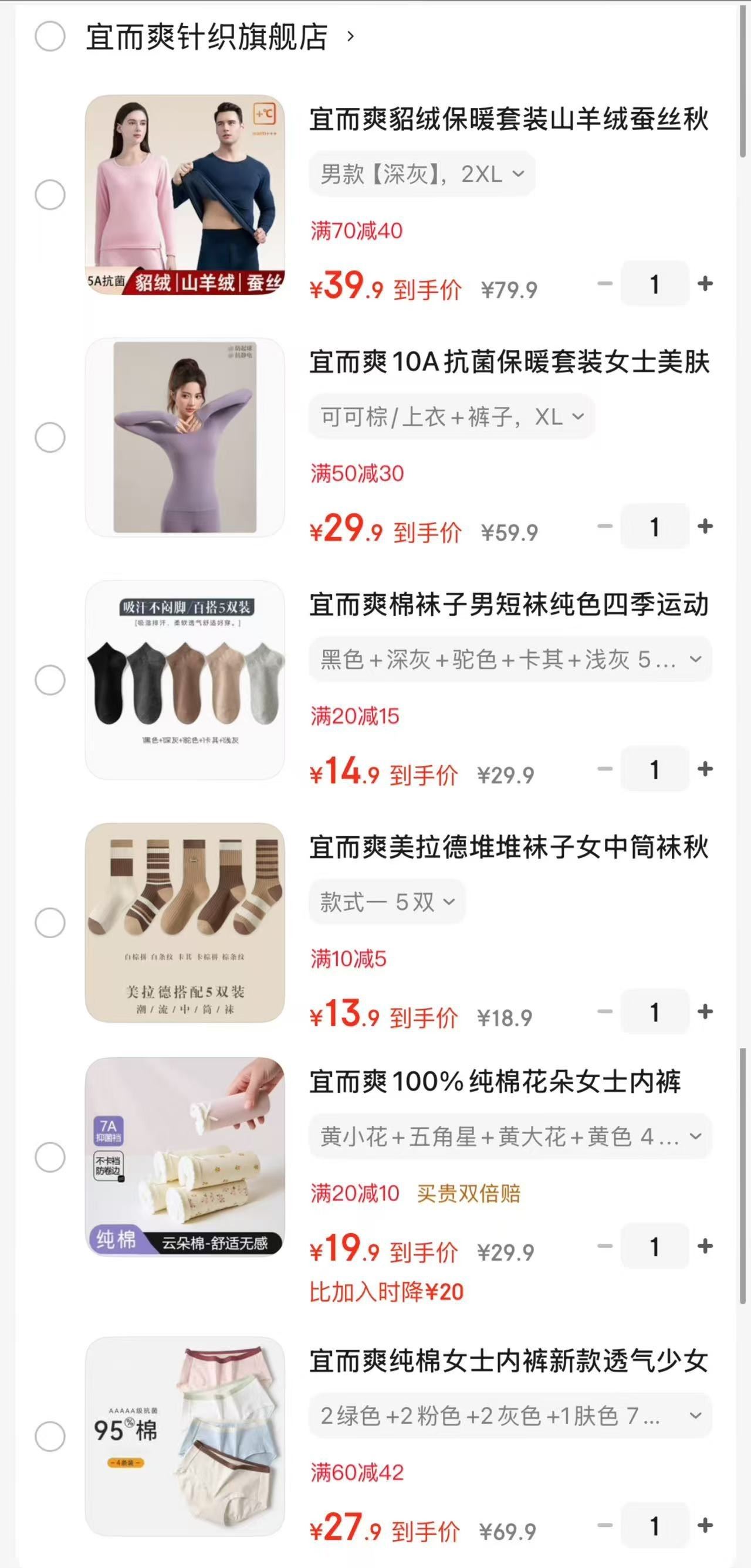 宜而爽 貂绒保暖套装山羊绒蚕丝【39.9】https://u.jd.com/A6qlLLf