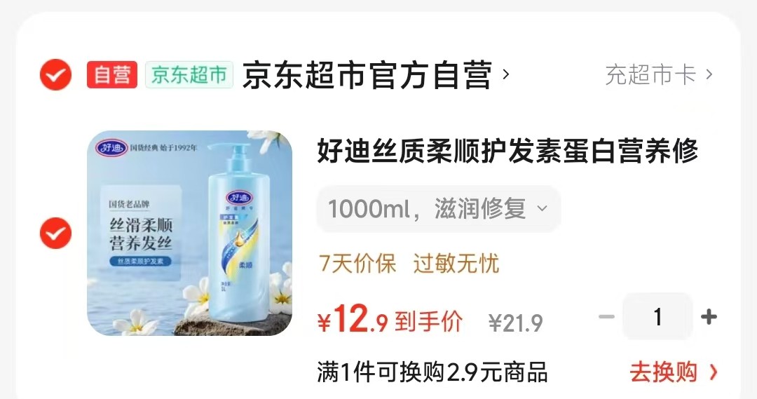 好迪 丝质柔顺护发素蛋白营养修护 1L【12.9】