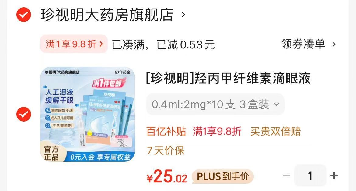 珍视明 羟丙甲纤维素滴眼液 0.4ml:2mg*10支 3盒装,首单后【25】