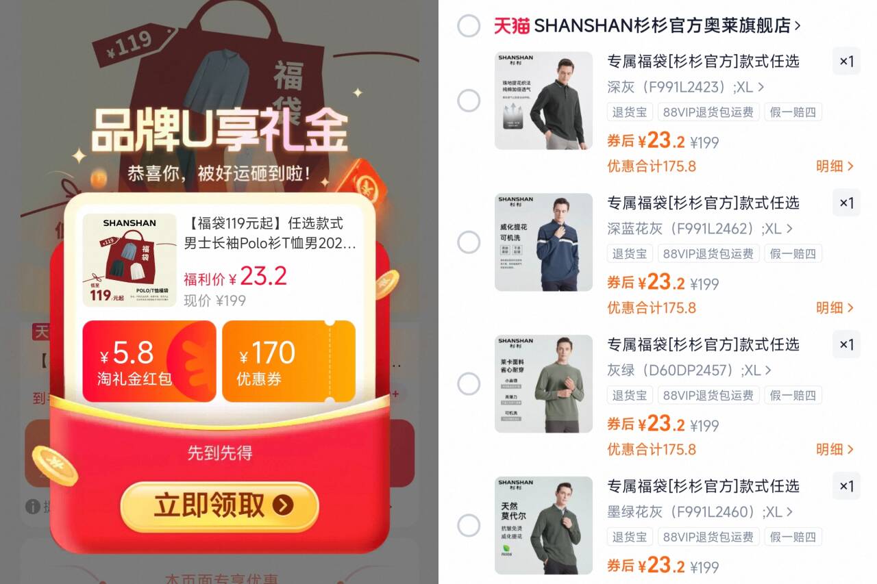 杉杉官方奥莱旗舰店 男士polo衫/针织衫/卫衣等 多款式,自选福袋23元好单发报员2025年12月24日 18:160举报 杉杉官方奥莱旗舰店男士polo衫/针织衫/卫衣等多款式,自选福袋23元https://m.tb.cn/h.7fLy4rB复制文案