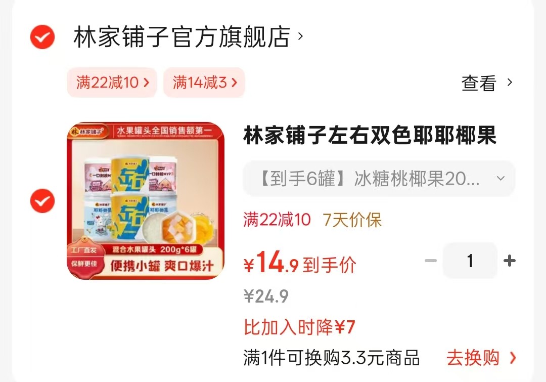 林家铺子 左右双色 冰糖桃椰果200g*6罐【14.9】