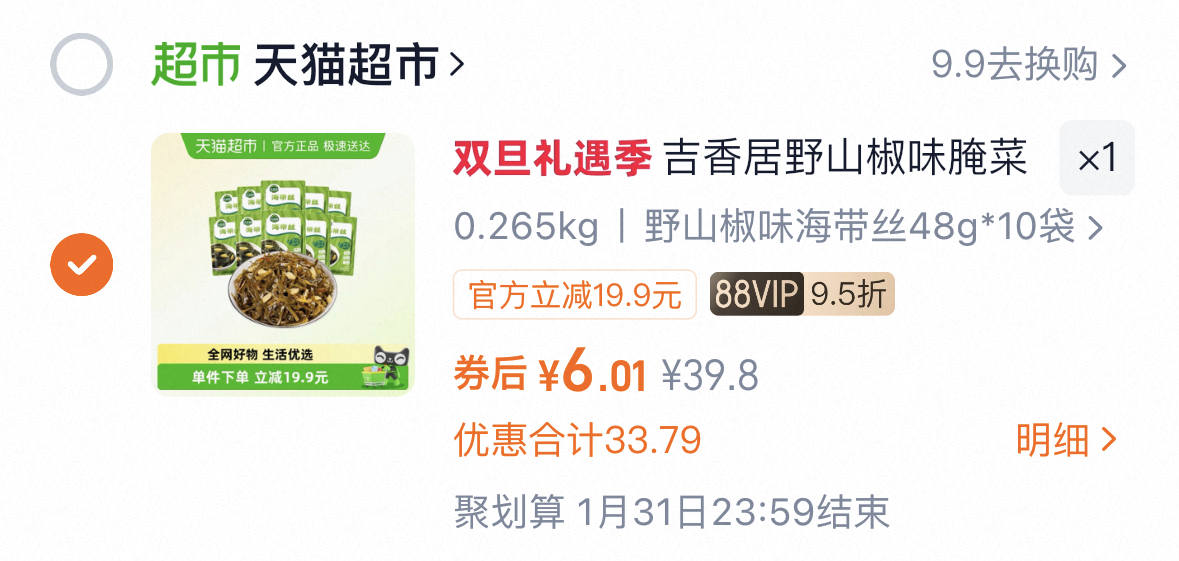 速,6亓,0.6/袋 吉香居 野山椒海带丝48g*10袋好单发报员2025年12月25日 00:090举报 速,6亓,0.6/袋吉香居 野山椒海带丝48g*10袋https://m.tb.cn/h.7fYSdMQ复制文案