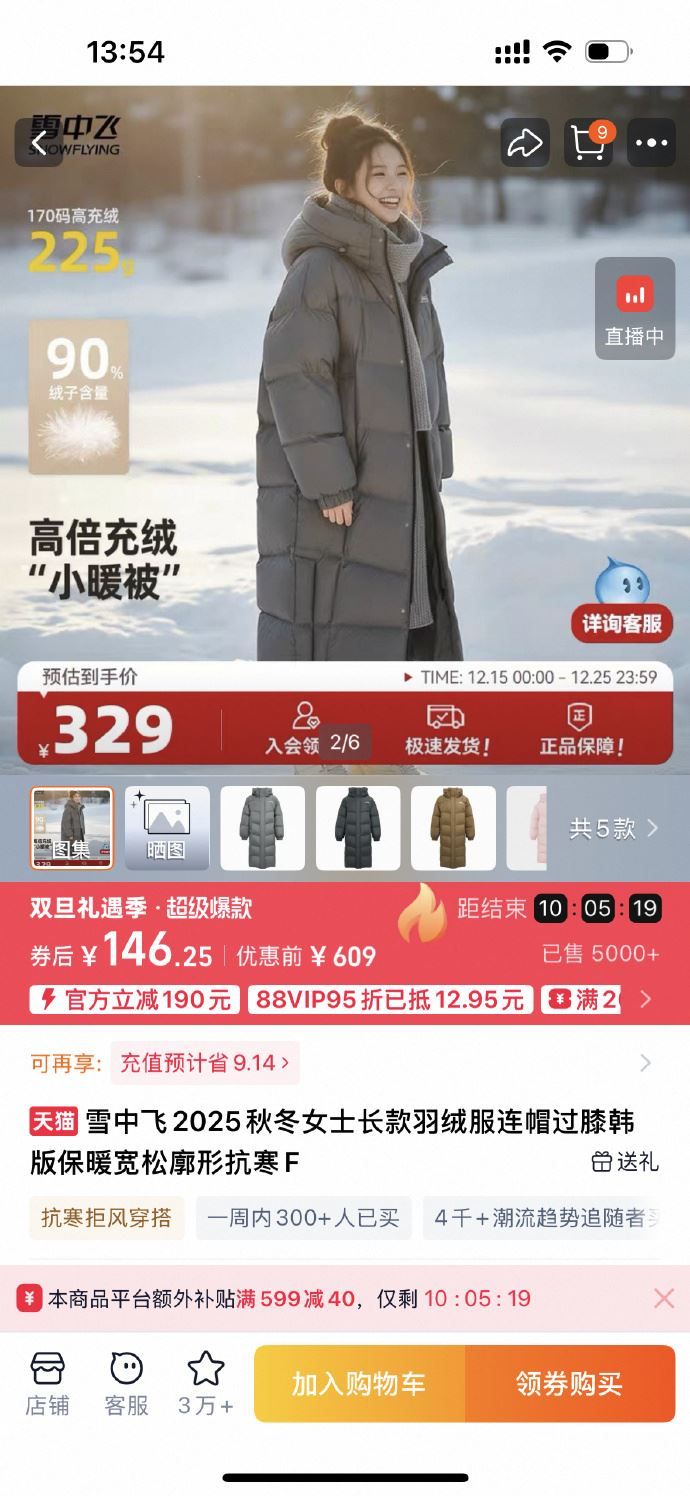 雪中飞 连帽长款羽绒服,弹窗礼金和券,从淘金币足迹加购,约146元