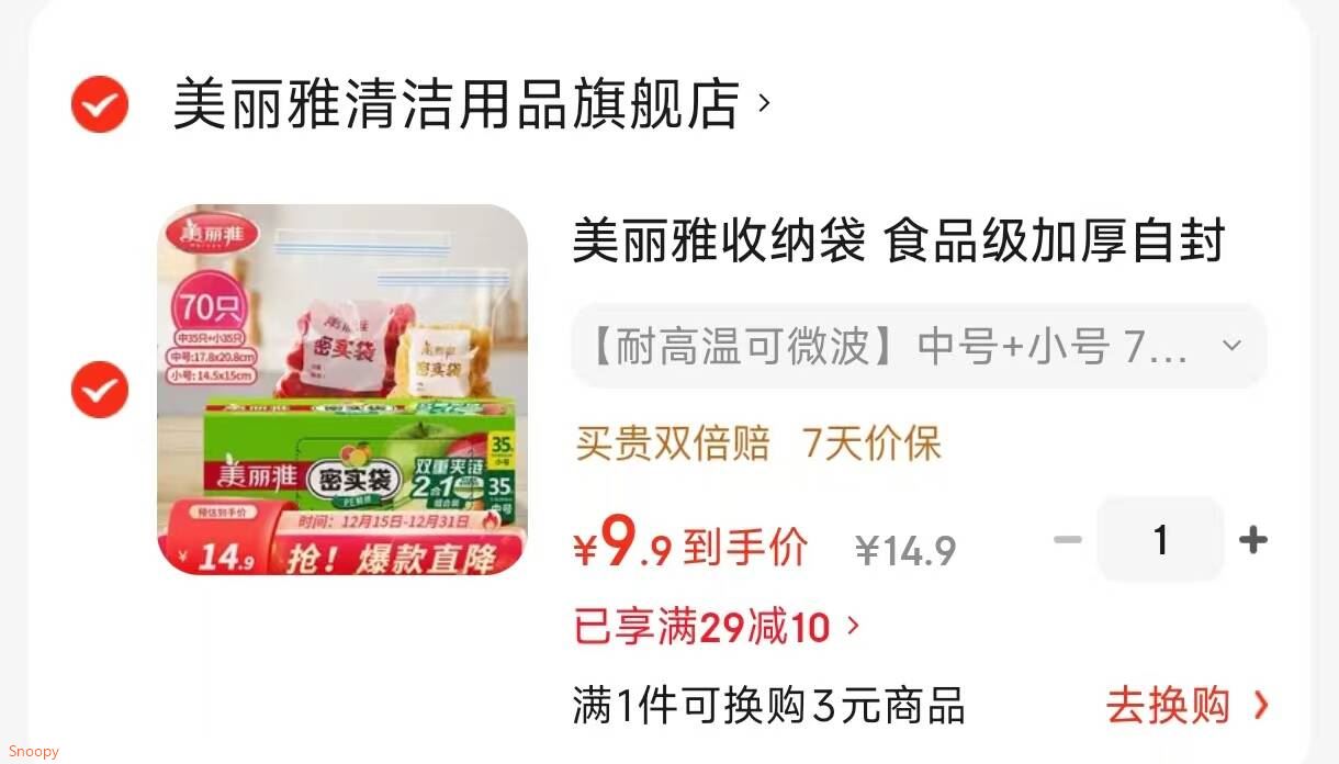 美丽雅 收纳袋 食品级加厚自封袋 中号 小号 70只,凑后【9.9】
