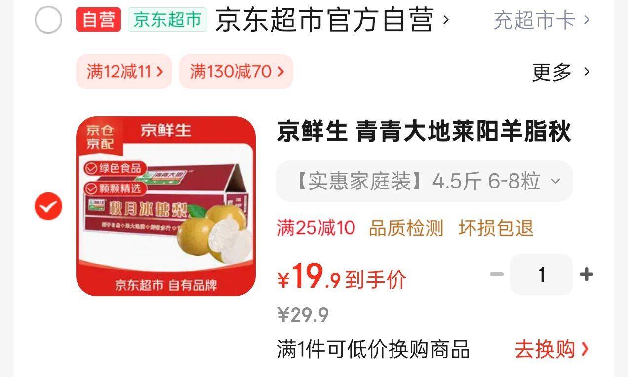 京鲜生 莱阳羊脂秋月梨4.5斤