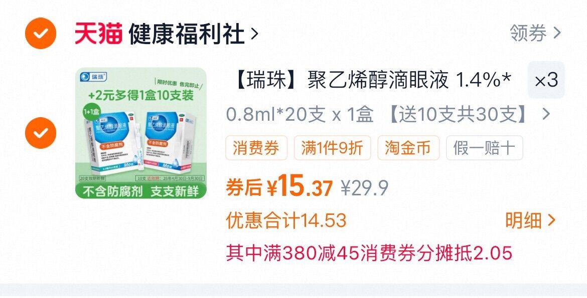 瑞珠聚乙烯醇滴眼液共90支 到手45.9亓