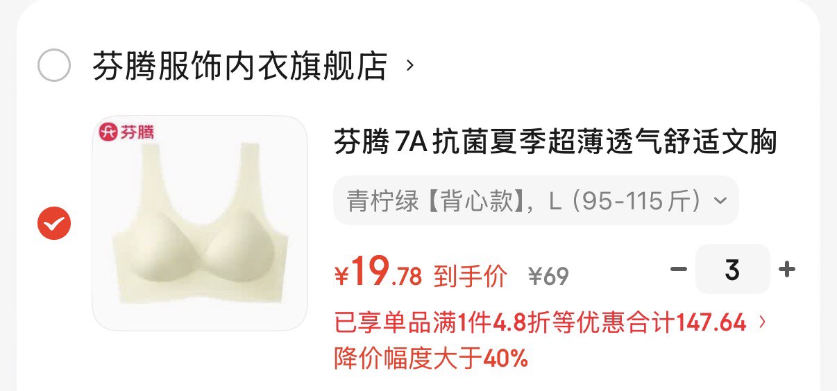 领 芬腾7A抗菌无痕内衣 任选3件59.7亓 折19.9/件