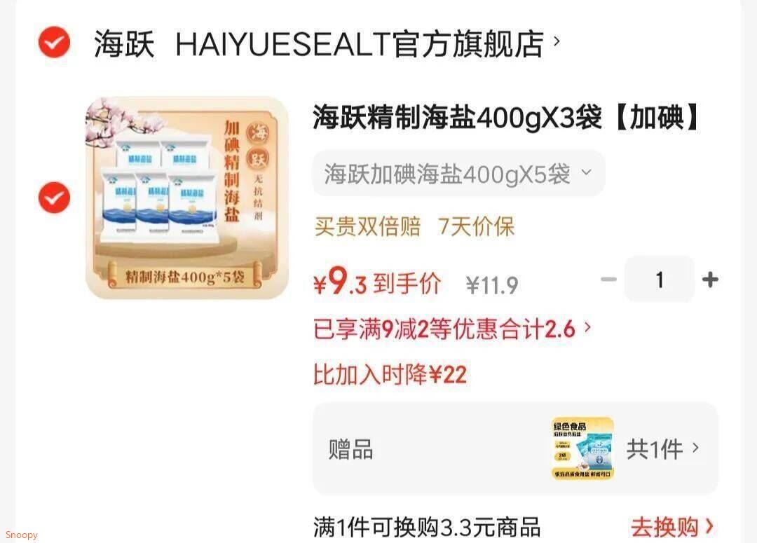 9.3元包邮 折1.3元/包! 海跃 日晒精制海盐400g*7袋 大包装更划算 无抗结剂更放心好单发报员2025年12月26日 17:290举报 9.3元包邮 折1.3元/包!海跃 日晒精制海盐400g*7袋https://u.jd.com/AGgNvUk 大包装更划算 无抗结剂更放心复制文案