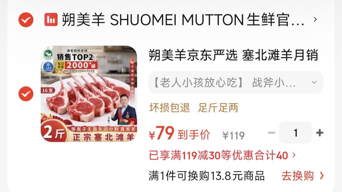 朔美羊生鲜·京东严选 战斧小羊排2斤共16支79元 空气炸锅/煎/炖都超好吃~好单发报员2025年12月26日 19:290举报 朔美羊生鲜·京东严选战斧小羊排2斤共16支79元空气炸锅/煎/炖都超好吃~https://u.jd.com/AarC9bk复制文案