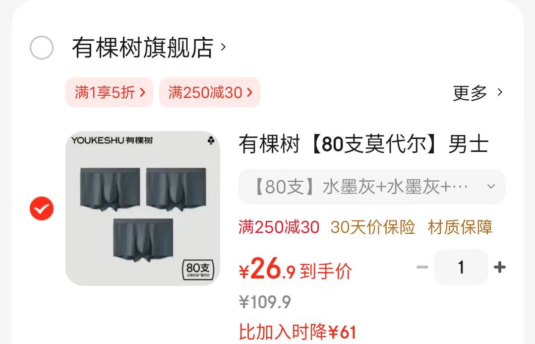 有棵树 80支莫代尔 男士内裤 3条【26.9】