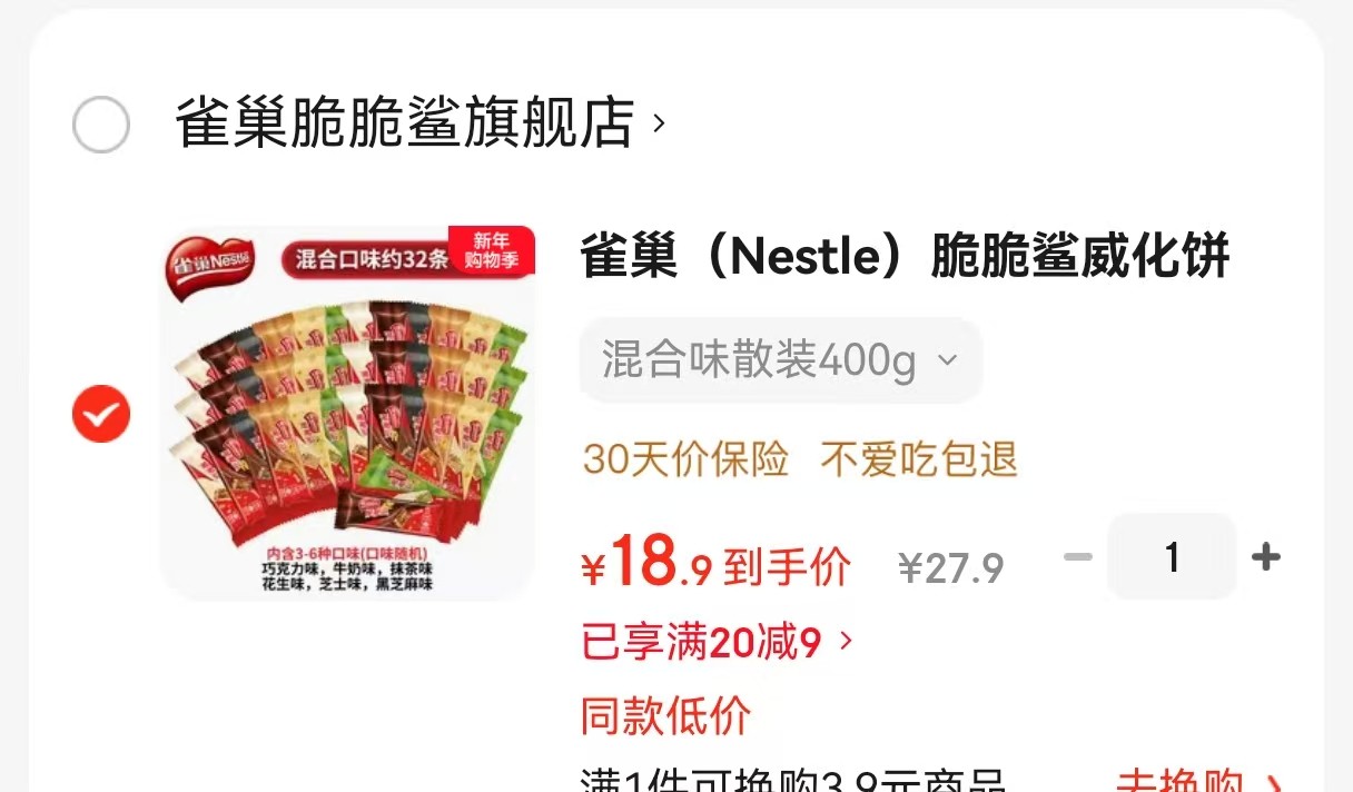 雀巢 (Nestle)脆脆鲨威化饼干400g 多口味散装约32条【18.9】