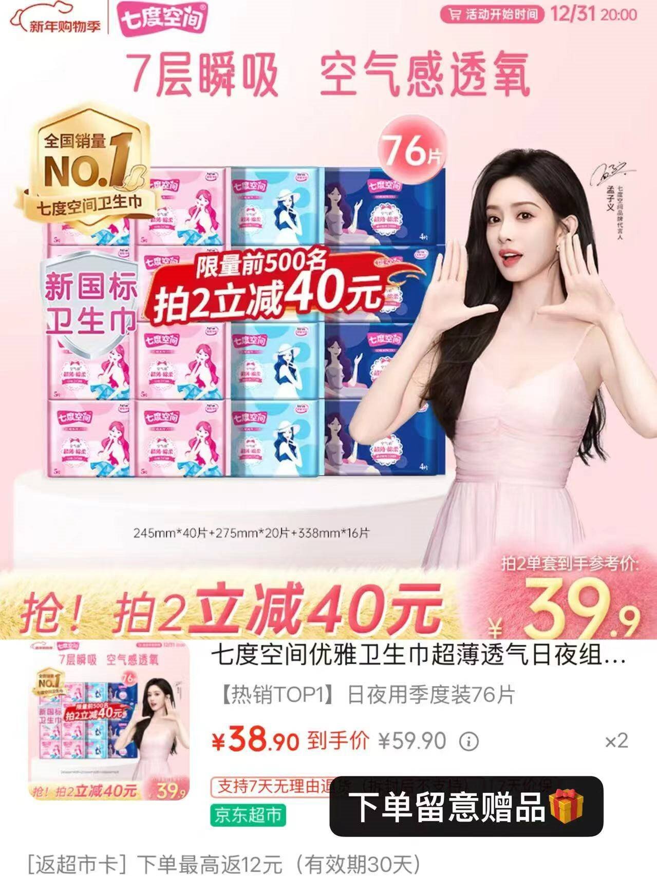七度空间个护車 自营 七度空间 日夜卫生巾76片 买2件79.8亓,赠12亓超.市卡好单发报员2026年01月01日 15:470举报 ——七度空间个护車——【自营】七度空间 日夜卫生巾76片https://u.jd.com/ArlLpVL买2件79.8亓,赠12亓超.市卡*新客下単减2亓 才折0.4亓/片复制文案
