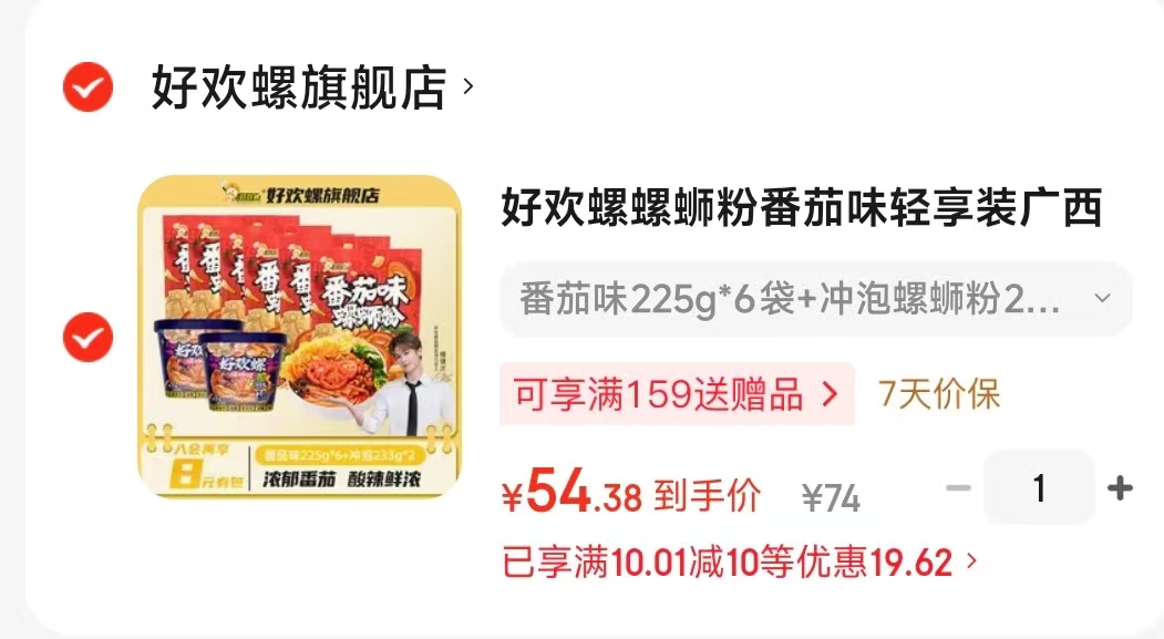 好欢螺 螺蛳粉番茄味轻享装225g*6袋 冲泡螺蛳粉258g*2桶【54.3】
