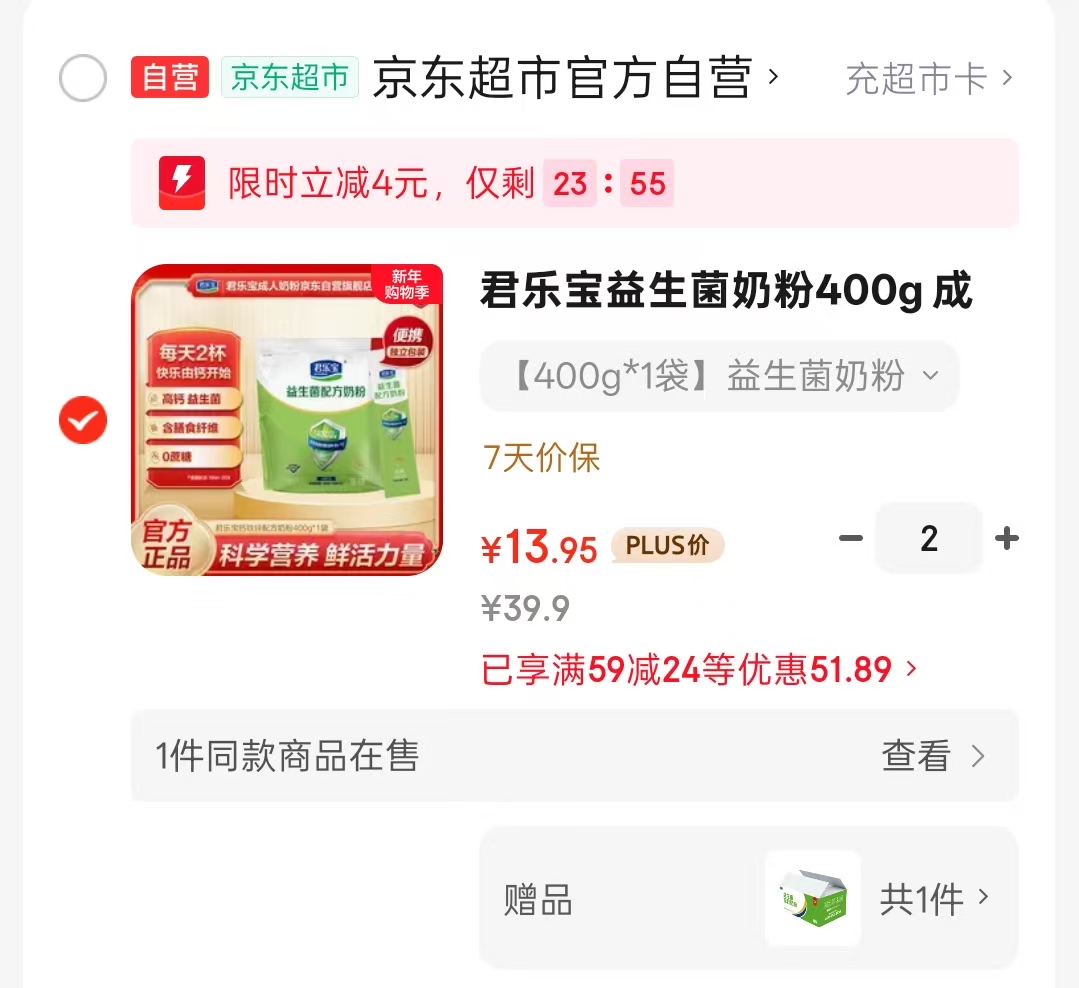 君乐宝 益生菌奶粉400g,拍2件 凑后【27.9】