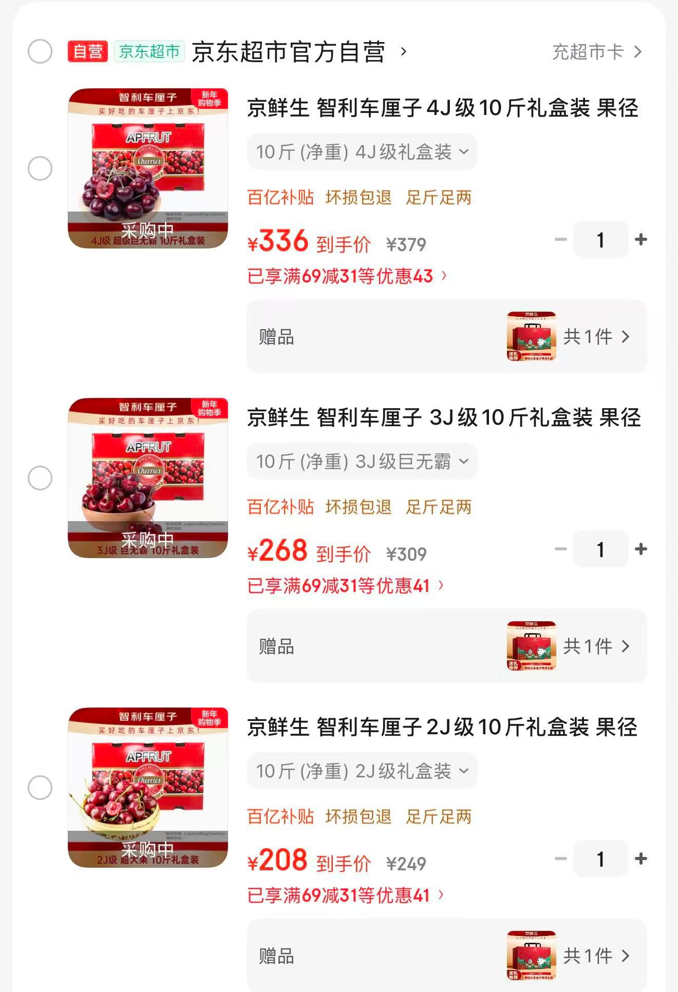 京鲜生 智利进口车厘子3J级10斤礼盒【268】